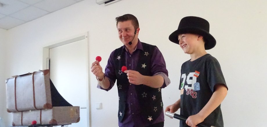 Gemeinsam mit Zauberer Chris erlebten die Kinder viele magische Momente. So wurde ein Malbuch auf zauberhafte Weise bunt, aus einem Hut erschienen plötzlich Blumensträuße, und wilde, durchsichtige Zauberbälle flogen durch die Luft – die Chris wie durch ein Wunder immer wieder einfangen konnte.