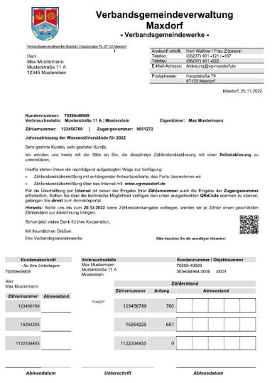 die VG-Werke Maxdorf versenden Ende November 2024 die Ablesepostkarten zur Selbstablesung der Wasserzählerstände.